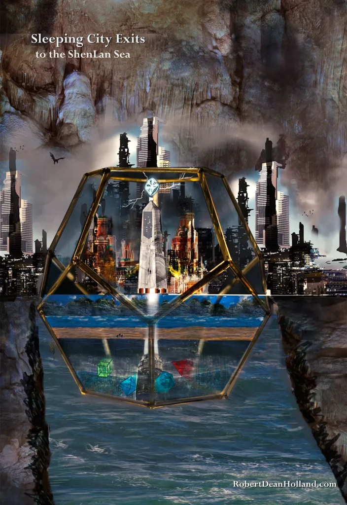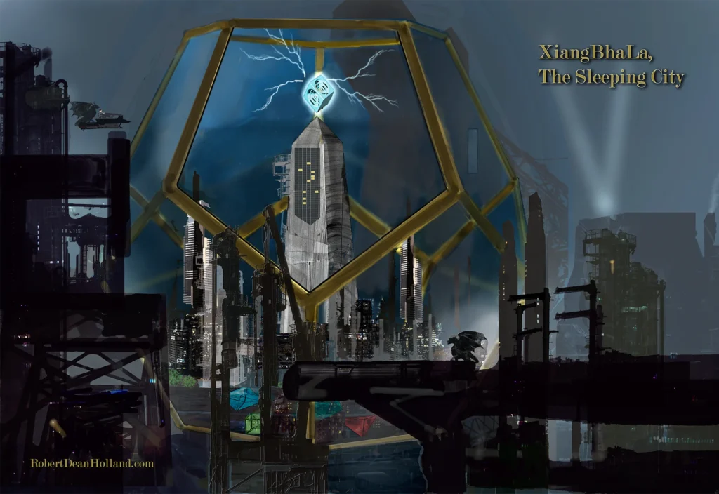 “An ancient-alien industrial complex lies within the gigantic cavern fully surrounding The-Sleeping-City itself, which is a vast dodecahedron. More than half of The-Sleeping-City rises up above street level within. Assuming the ancient NuliZhu methodology of measurement inherited by us to this very day are the same, the Huan Long Shui archives reveal the overall height of the dodecahedron as between 13-kilometers and 14-kilometers, but the truth of this lies buried in the dust-of-ages. The archives never name the surrounding industrial complex, so I made notes to deem it the Outer City of XiangBhala, which is actually the great dodecahedron we commonly refer to as The-Sleeping-City—two names, one place.